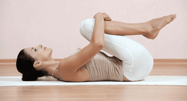 Hướng dẫn: Nằm ngửa trên thảm và co hai đầu gồi lại với nhau. Dùng hai tay ôm gối và dùng lực ép chặt hai gối vào ngực. Hít vào và thở ra đều đặn.