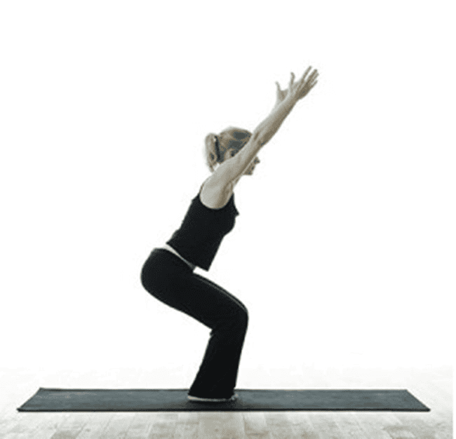Hướng dẫn: Đứng thẳng trên thảm với hai chân dang rộng, bàn chân hướng xéo ra ngoài. Từ từ hạ phần hông xuống giống như bạn đang ngồi ghế, hai tay giơ thẳng lên cao. Giữ trong 10 nhịp